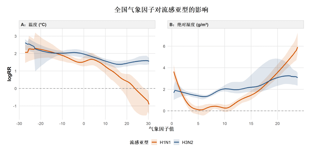 亚型拆解:H3N2与H1N1的气象条件“偏好”迥异。团队前期机理研究表明,H1N1亚型更适应低温环境,其传播风险随温度升高而迅速下降;而H3N2亚型则在较宽的温度范围(尤其是10-25℃)内保持稳定的传播效力。在湿度响应上,两者也截然不同:H1N1呈“U型”曲线(极干或极湿时风险高),而H3N2的风险则随绝对湿度上升呈近线性增长。
