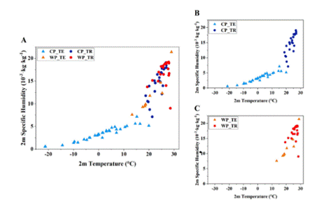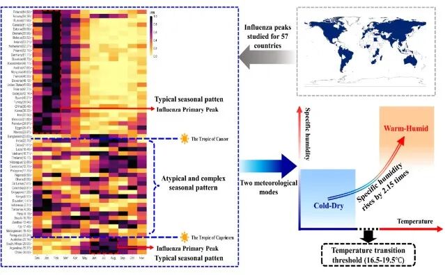 绘制全球图谱:通过对全球57个国家流感样病例与气象数据的综合分析,在国际上提出了驱动流感流行的两种基本气象模态,即干冷模式与暖湿模式,并量化了其相互转换的温度阈值(16.5-19.5℃)。在全球尺度上提出,流感干冷模式如果要向暖湿模式转换,比湿需要增加2.15倍,以绝对水汽的增加弥补气温升高对流感流行性的抑制作用,这为理解纬度造成的季节性差异提供了统一的框架[1]。