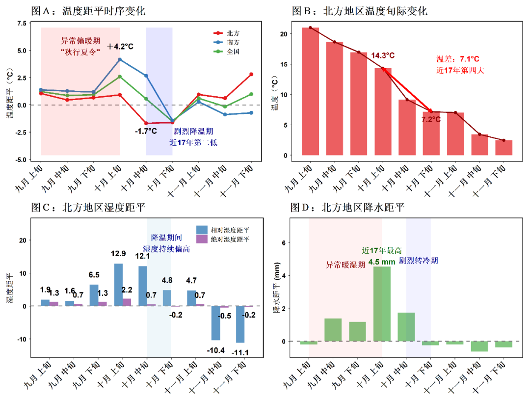 图6 2025年全国35个城市(一线和二线)9-11月气象要素特征统计图(距平值是与2009-2025年气象条件平均状况相比)
