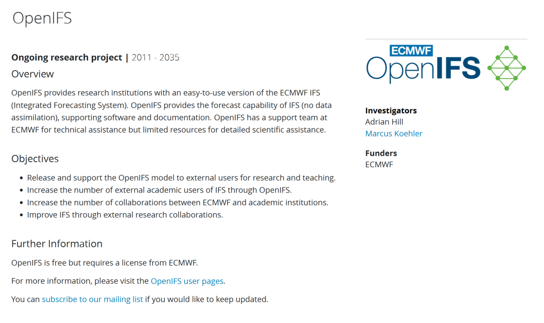 OpenIFS模型是集成预报系统(IFS)的研究、教育和培训版本,此前仅在获得许可的情况下使用(例如在机构内部使用)。现在,ECMWF将OpenIFS的预报系统完全开源。