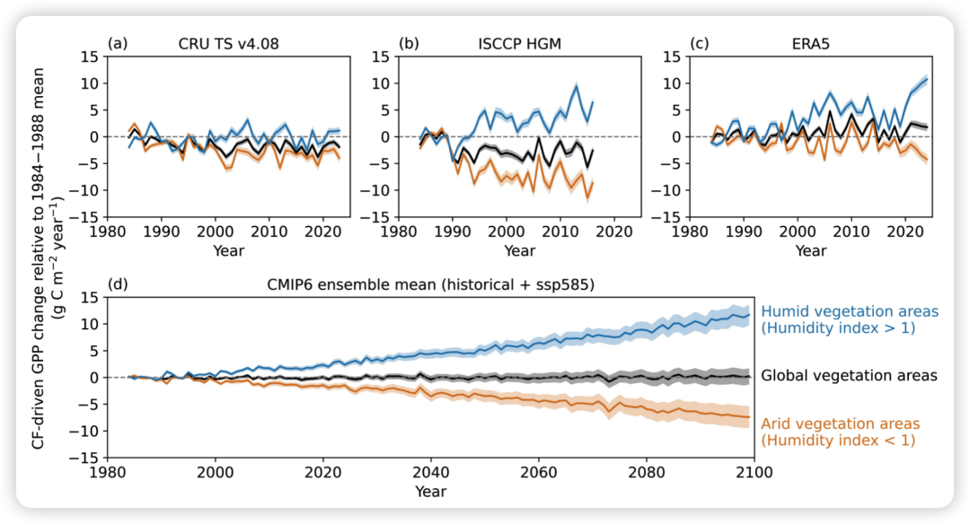 研究进一步指出,在全球变暖背景下,云量的变化会导致干旱地区植被总初级生产力进一步下降,而湿润地区植被总初级生产力进一步上升。这种不对称变化可能加剧全球生态系统功能的不均衡,使干旱区更脆弱,湿润区更具增长潜势。