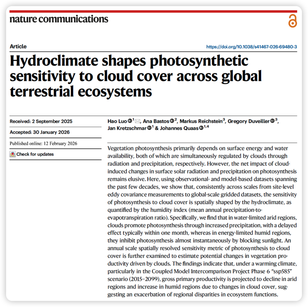 云的变化不仅影响气候系统,也深刻作用于陆地生态系统。近日发表于《Nature Communications》的一项研究发现,云层通过调节地表太阳辐射和降水,在不同水文气候区对植被生产力的影响方向相反。在干旱地区,云能促进植被生长;在湿润地区,云则抑制光合作用。