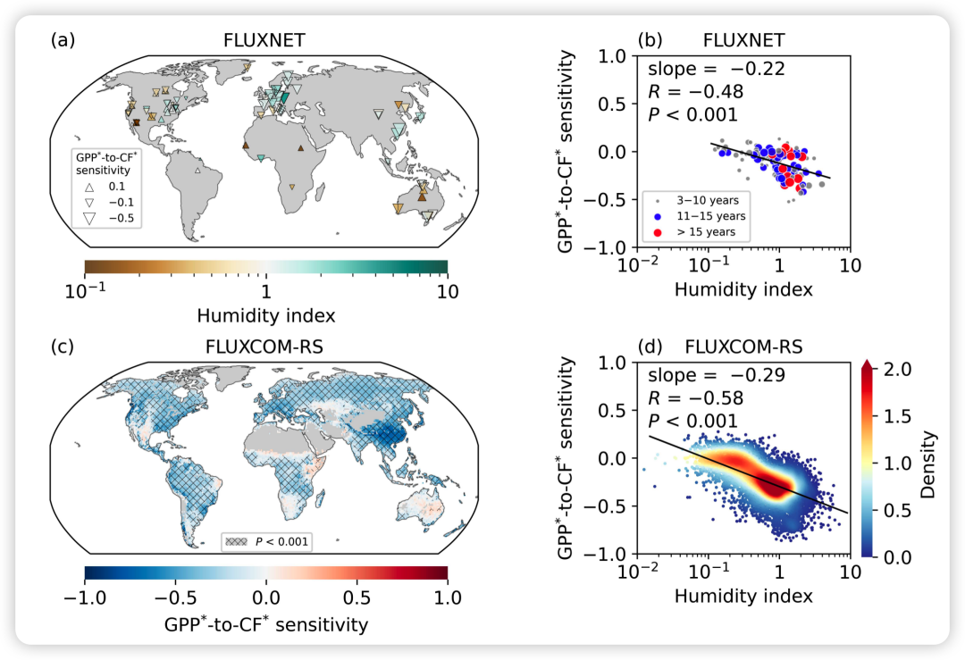 植物光合作用依赖两个基本条件:光照和水分。云层同时影响这两个关键因素,它既遮挡太阳辐射,又带来降水。研究团队整合了过去数十年的地面涡度协方差观测数据和全球尺度模型数据,从站点尺度到全球尺度系统评估了云量变化对植被总初级生产力的影响。结果显示,在水分受限的干旱地区,云量增加通常带来更多降水,从而缓解土壤水分限制,促进植被生长,这种促进效应通常具有一定的时间滞后。在能量受限的湿润地区,水分并非主要限制因素,植被对太阳辐射更加敏感,云层对光照的遮挡几乎瞬时抑制光合作用。这表明,同样的云在不同生态系统中发挥着截然不同的调节作用。