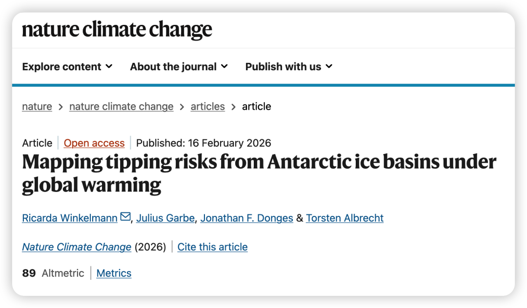 • Ricarda Winkelmann (通讯作者):德国波茨坦气候影响研究所(PIK)地球韧性科学部、马克斯·普朗克地球人类学研究所整合地球系统科学部、波茨坦大学物理与天文研究所 • Julius Garbe :德国波茨坦气候影响研究所地球韧性科学部、波茨坦大学物理与天文研究所 • Jonathan F. Donges :德国波茨坦气候影响研究所地球韧性科学部、马克斯·普朗克地球人类学研究所整合地球系统科学部、斯德哥尔摩大学斯德哥尔摩韧性研究中心 • Torsten Albrecht :德国波茨坦气候影响研究所地球韧性科学部、马克斯·普朗克地球人类学研究所整合地球系统科学部 资助机构: 欧盟地平线2020计划(TiPACCs、PROTECT、OCEAN ICE、ClimTip项目)、德国研究基金会(DFG)、德国联邦教育与研究部(BMBF)、欧洲研究委员会(ERC)、美国国家航空航天局(NASA)、美国国家科学基金会(NSF)等。