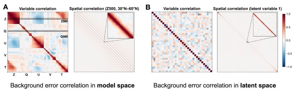 尽管隐空间维度显著降低,但若使用满秩的隐空间背景误差协方差矩阵 Bz,其规模仍可达109量级,工程上难以求解。但在实践中发现,在物理空间复杂的协方差关系在隐空间消失了,Bz 天然近似对角,因此可以用对角近似。这显著降低了隐空间同化的工程实现难度。