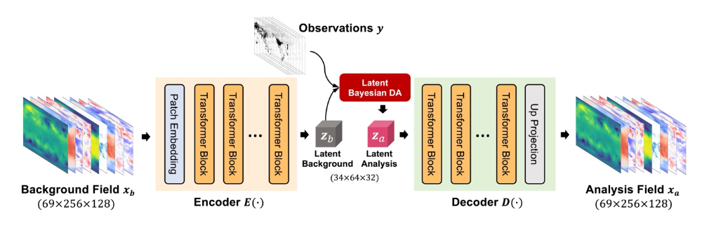 隐空间资料同化(Latent Data Assimilation, LDA)的基本流程是:先用自编码器(Autoencoder)的编码器(Encoder)将高维背景场编码为隐变量 zb,再集合观测 y 在隐空间中进行变分同化得到隐空间分析 za,最后通过解码器(Decoder)将 za 还原为模式空间分析场 xa。