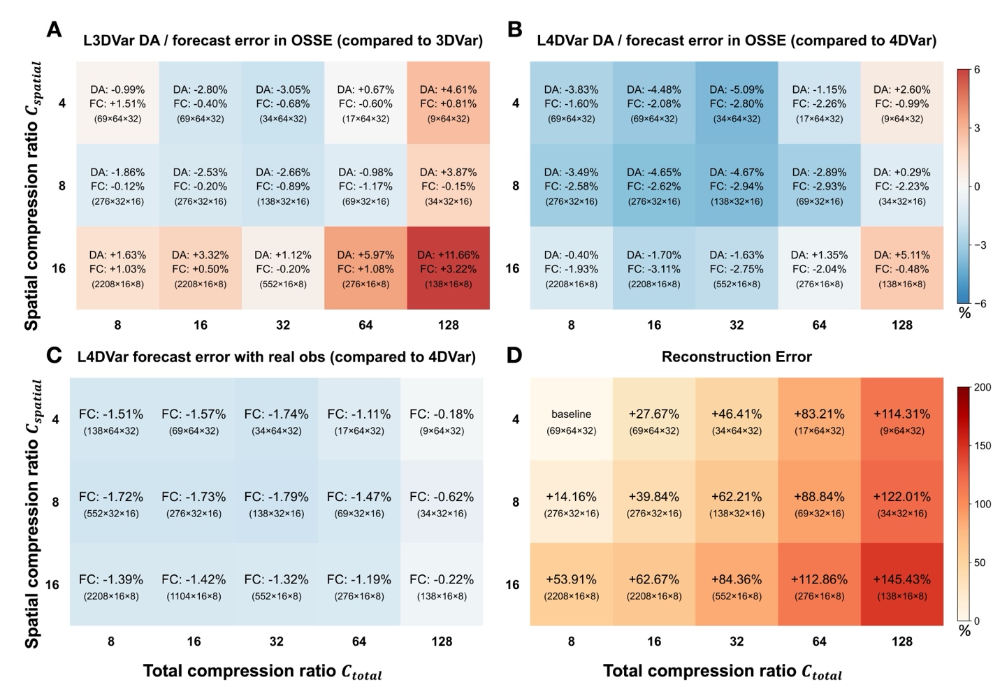 真实观测循环同化试验(图C) - 在 2017 年循环同化中,用未同化观测验证分析场:69 个变量中有 54 个变量,L4DVar 分析更准;平均误差降低约 5%。