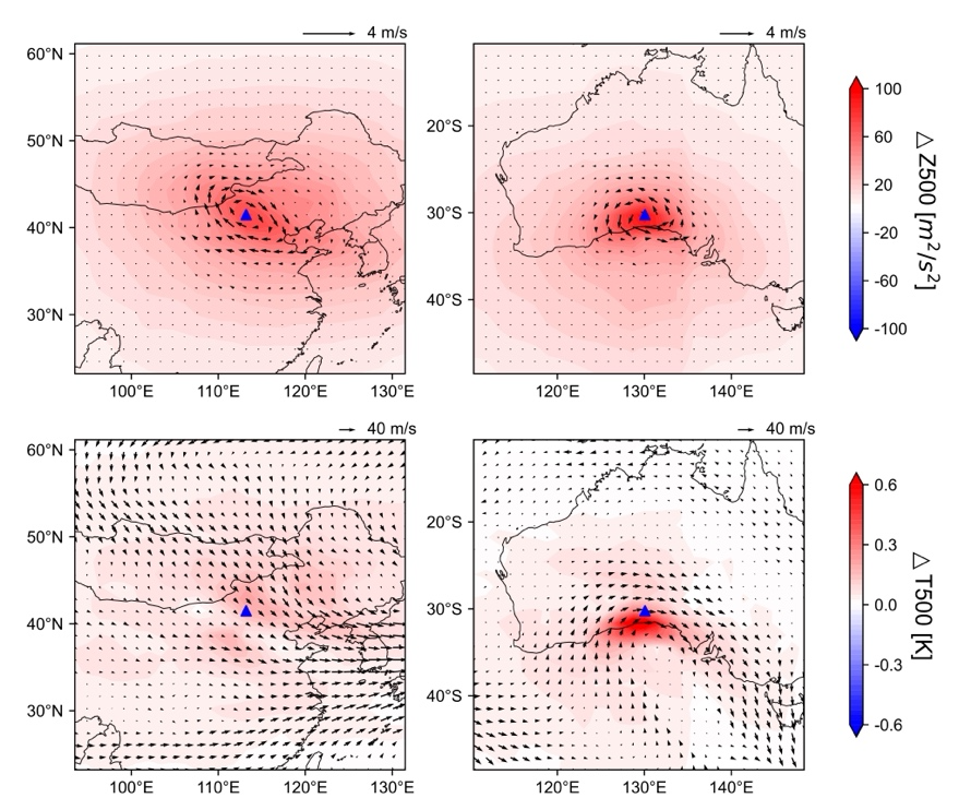 在 L3DVar 中使用静态、对角的 Bz ,仅对 500 hPa 位势高度(Z500)施加一个单点扰动(+200m2/s2),分别将扰动中心放在中国(北半球)与澳大利亚(南半球)。背景场取 2017-12-01 00 UTC 的 ERA5。图中给出位势高度与风场的分析增量(第一行),以及温度增量与背景风场(第二行)。