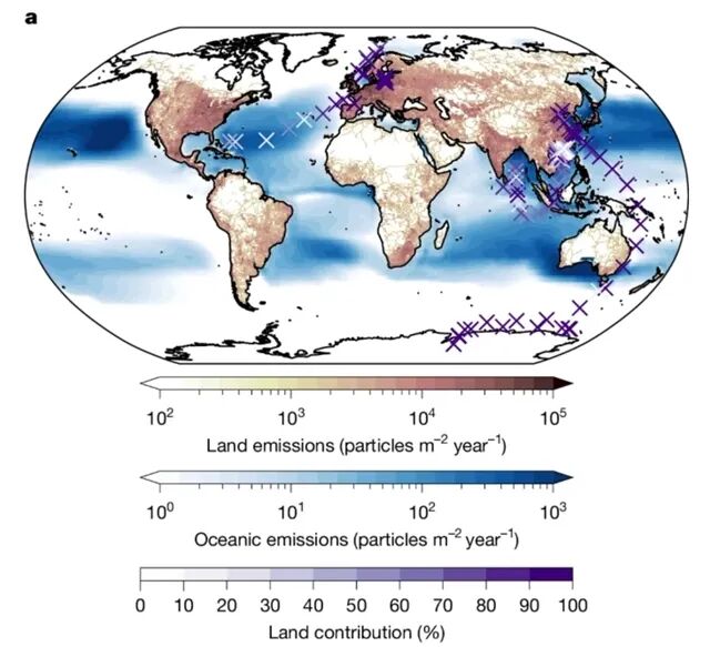 排放量估算:缩放后的全球陆地排放为6.1×10¹⁷ particles year⁻¹(0.0005 Tg year⁻¹),海洋排放为2.6×10¹⁶ particles year⁻¹(0.004 Tg year⁻¹),陆源排放数量约为海源的23倍。