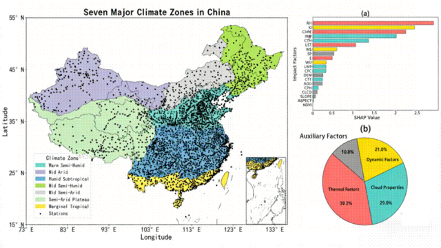 机器学习识别降水影响因子。研究融合LGBM机器学习模型与SHAP可解释人工智能工具,开展中国区域降水影响因子的识别与量化分析。发现影响因子对降水的影响非均一性突出,受区域气候背景、季节热力动力条件约束。