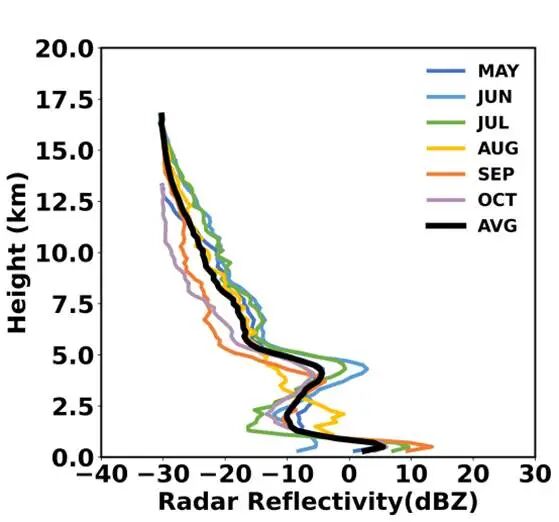 图1. 暖季西南涡系统下雷达反射率发生概率的垂直分布