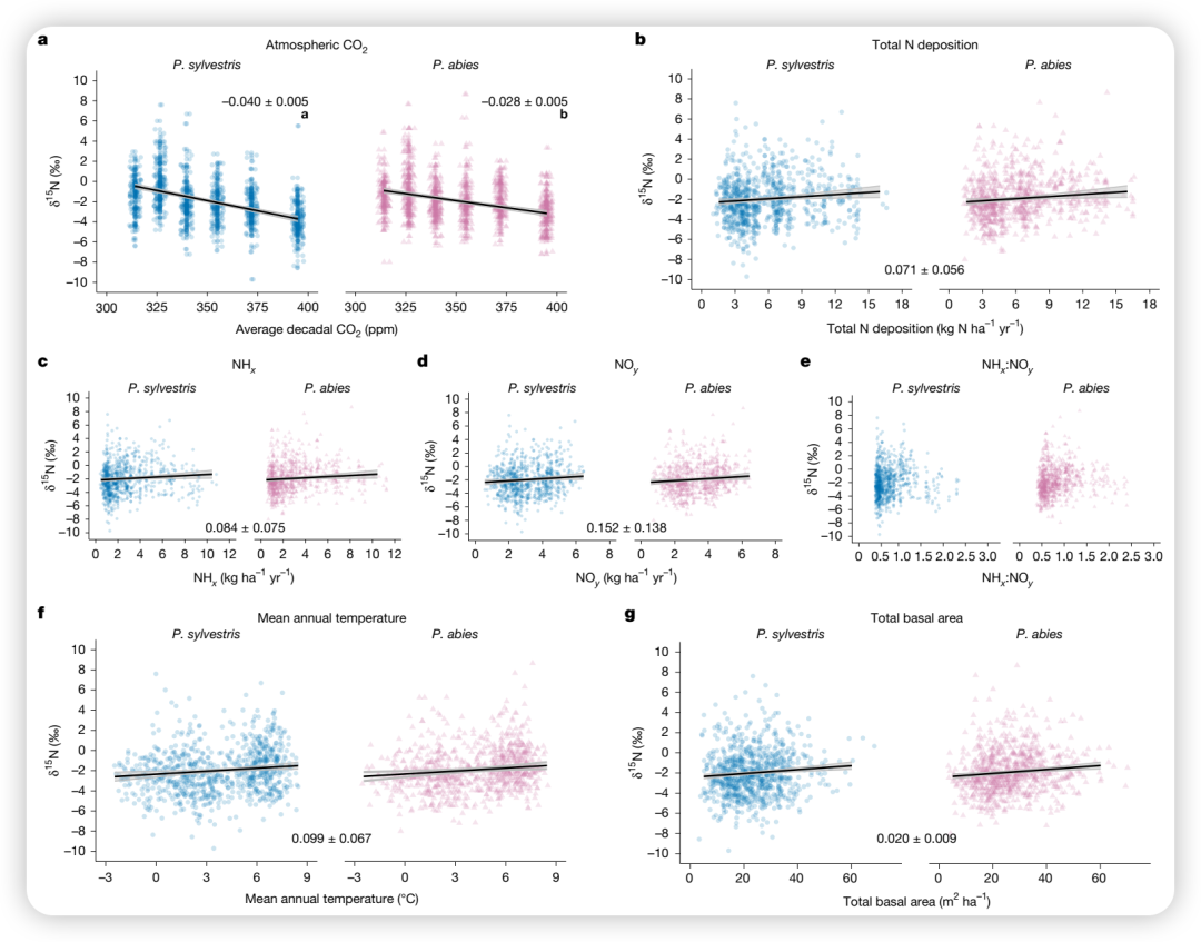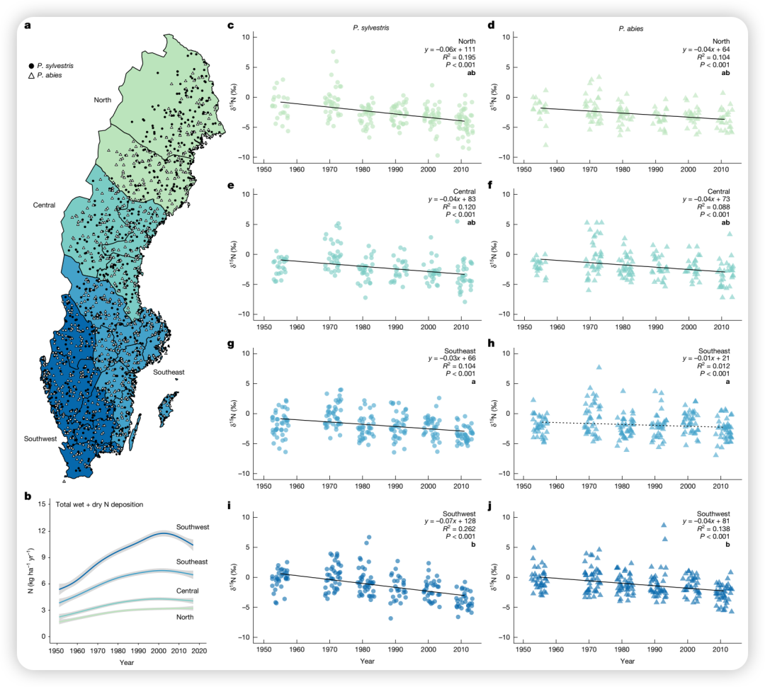 CO₂施肥效应促进森林生长,增加生物量积累,从而加大对土壤氮库的"开采"压力。瑞典NFI数据显示,自1950年代以来,所有区域的森林材积生长量(volume growth)均呈长期上升趋势。研究进一步发现,相对材积生长量变化与δ¹⁵N呈显著负相关(图3c,d),支持了"增加的生长导致氮需求增加,进而降低氮有效性"的PNL机制。
