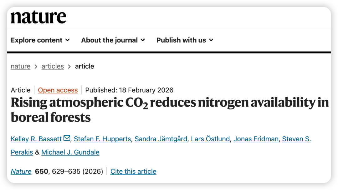 Bassett, K.R., Hupperts, S.F., Jämtgård, S. et al. Rising atmospheric CO2 reduces nitrogen availability in boreal forests. Nature650, 629–635 (2026). https://doi.org/10.1038/s41586-025-10039-5