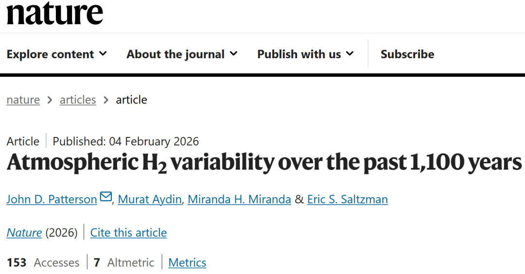 近日,美国加州大学欧文分校John D. Patterson团队研究了过去1100年大气H2的变化。该项研究成果发表在2026年2月4日出版的《自然》杂志上。