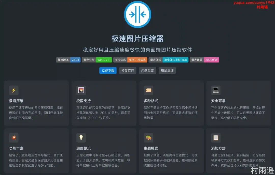 稳定好用且压缩速度极快的桌面端图片压缩软件,支持 7 种格式,单张最大 2 GB,最大支持 20000 张。