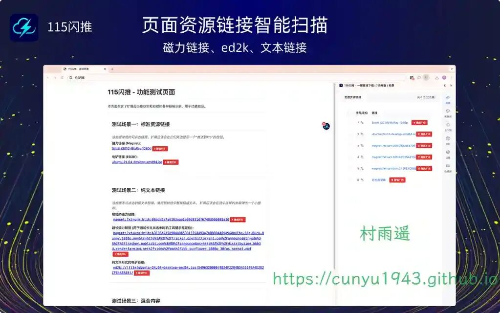 智能收集网页中的所有的资源链接 (磁力链接、ED2k、种子)。一键批量推送到 115 网盘离线云任务。
