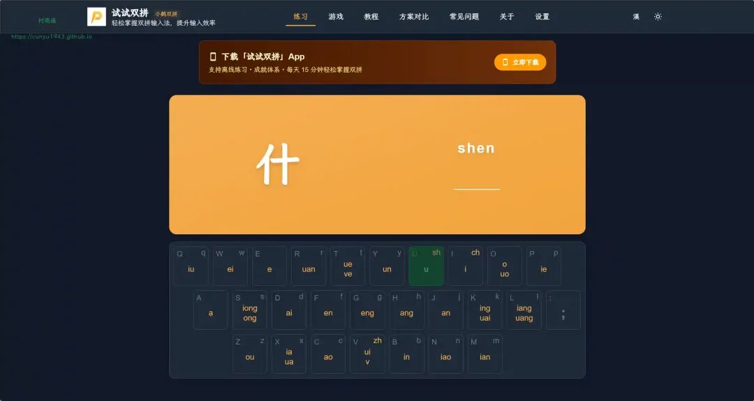 免费在线双拼练习工具,支持自然码、搜狗双拼、小鹤双拼、微软双拼等 7 种主流方案。提供实时反馈、虚拟键盘、进阶模式等功能,帮助你快速掌握双拼输入法,显著提高打字速度和输入效率。零基础入门,专业练习平台。