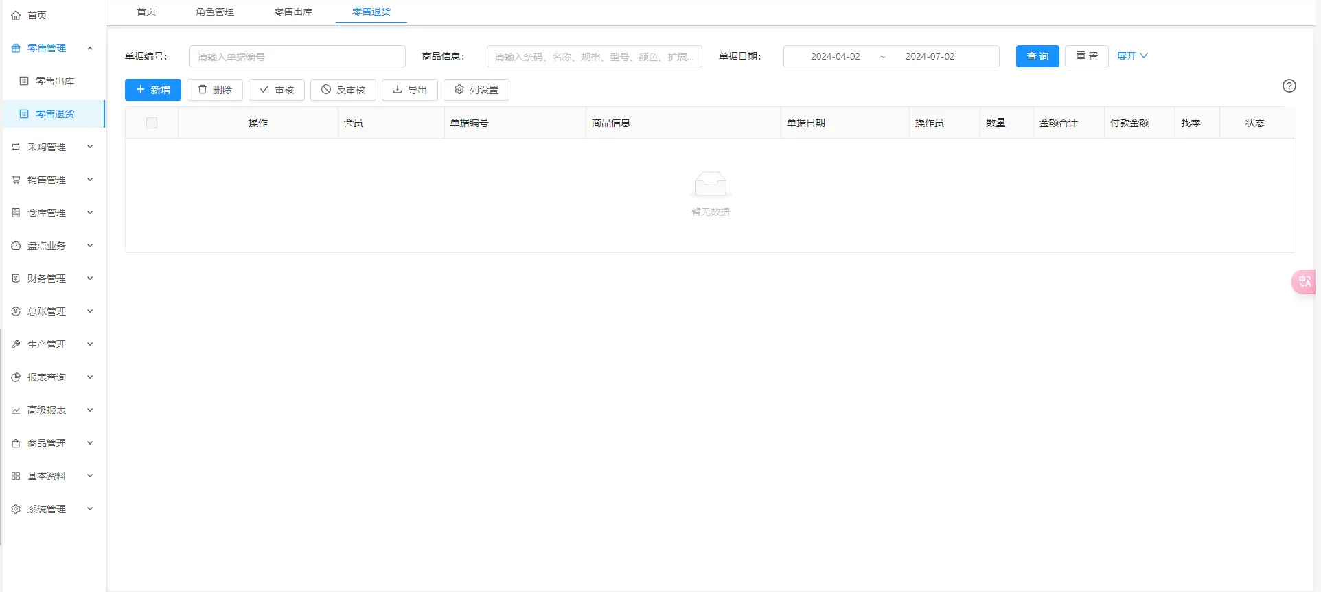 - 2、零售退货:记录零售出库单据的退货信息。零售退货单可单独创建,也可以由零售出库单转换而来。