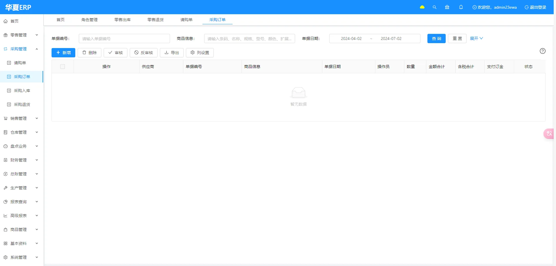 - 采购管理:管理采购的相关记录,核心模块分为采购订单、采购入库和采购退货三个模块。