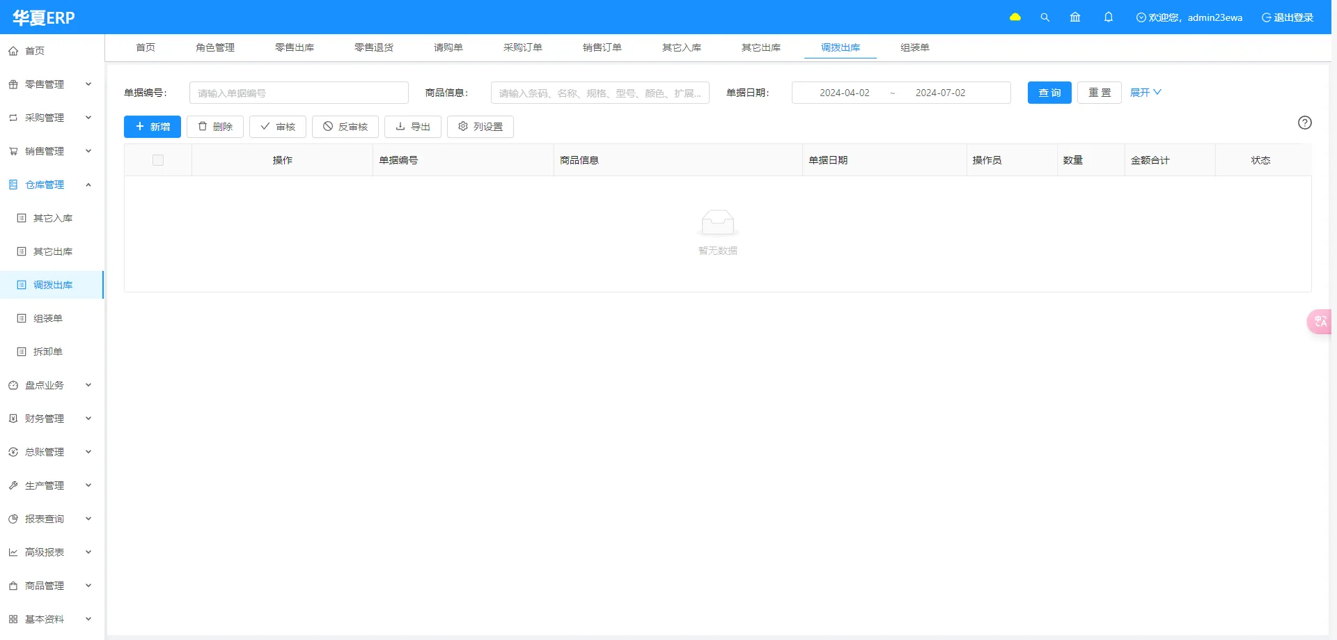 - 仓库管理:管理出入库的信息,方便报表可视化。核心模块分为:其他入库、其他出库、调拨出库、组装单等