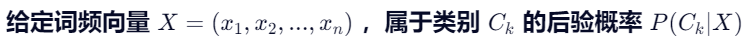 💡 核心思想:对于每个类别,每个词都有一个独立的概率。新文档的类别,由其所有词的频率加权决定。