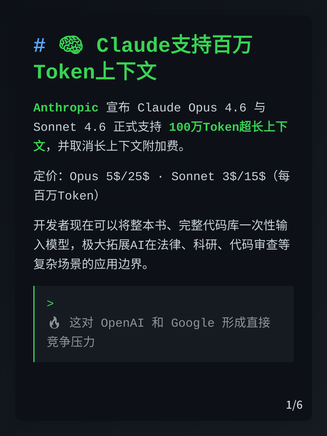 Anthropic 正式宣布 Claude Opus 4.6 与 Sonnet 4.6 支持 100万Token超长上下文窗口,并取消长上下文附加费。定价:Opus 每百万Token 5美元/25美元,Sonnet 3美元/15美元。开发者现在可以将整本书籍、完整代码库一次性输入模型,极大拓展AI在法律、科研、代码审查等复杂场景的应用边界,同时对 OpenAI 和 Google 形成直接竞争压力。