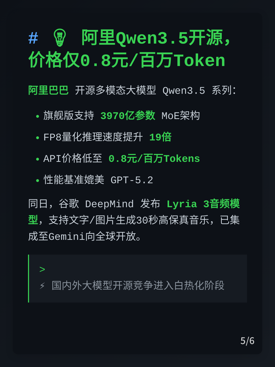 阿里巴巴正式开源多模态大模型 Qwen3.5系列,旗舰版支持 3970亿参数混合专家(MoE)架构,FP8量化下推理速度提升 19倍,API价格低至 0.8元/百万Tokens,性能基准媲美 GPT-5.2。同日,谷歌 DeepMind 发布 Lyria 3音频模型,支持文字/图片生成30秒高保真音乐,已集成至 Gemini 向全球开放测试。