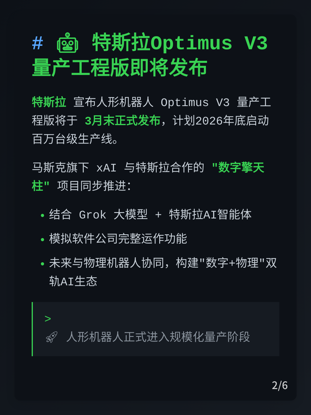 特斯拉宣布人形机器人 Optimus V3量产工程版将于 3月末正式发布,计划2026年底启动百万台级生产线,标志着人形机器人正式进入规模化量产阶段。马斯克旗下 xAI 与特斯拉合作的「数字擎天柱」项目同步推进,结合 Grok 大模型与特斯拉AI智能体,未来将与物理机器人协同,构建「数字+物理」双轨AI生态。
