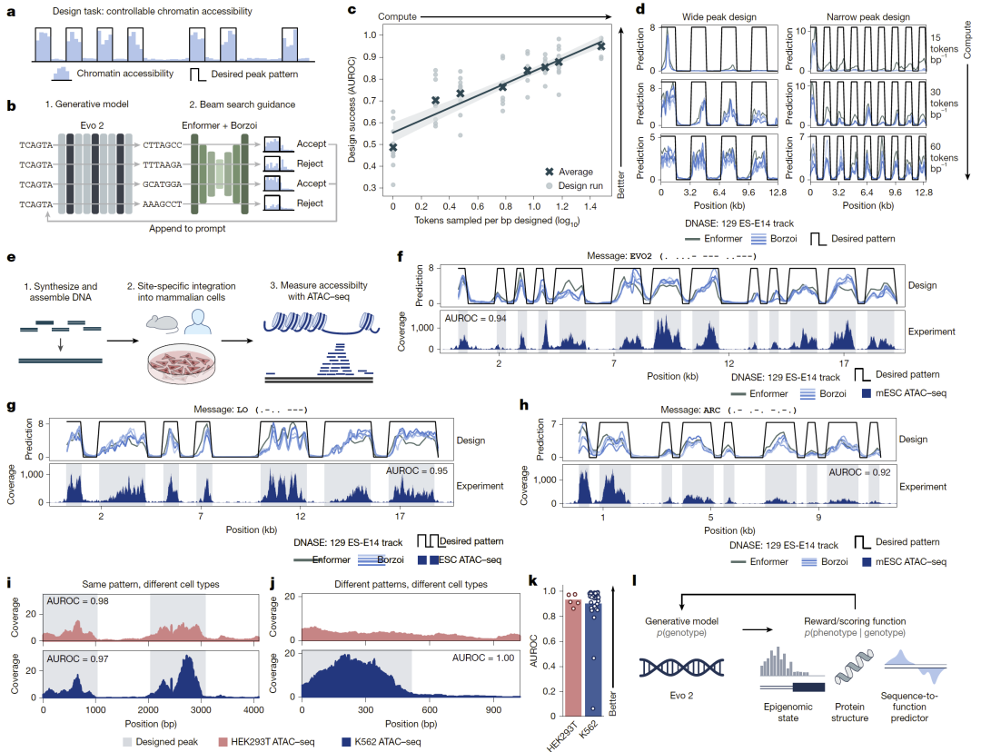 在与预测模型结合后,Evo 2 还能生成具有特定功能的序列,例如控制染色质可及性的调控序列。实验结果表明,部分生成序列在真实生物系统中表现出预期功能,显示出该模型在生物设计方面的潜力。