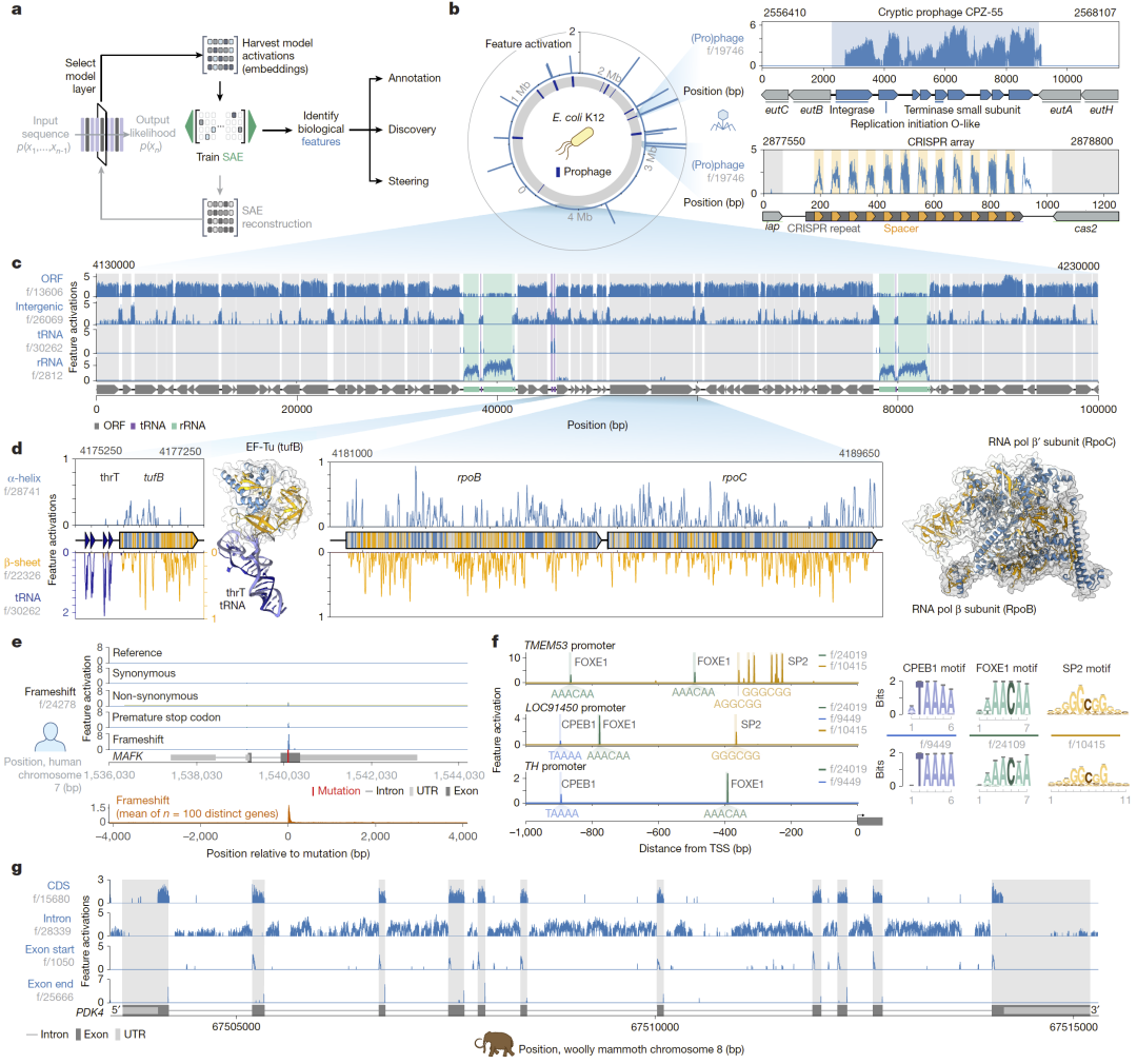 为了理解模型内部学习到的生物学知识,研究人员使用稀疏自编码器分析 Evo 2 的内部表示。结果发现,模型内部出现了与多种生物学结构相关的特征,例如前噬菌体区域、开放阅读框、tRNA 与 rRNA 区域等。