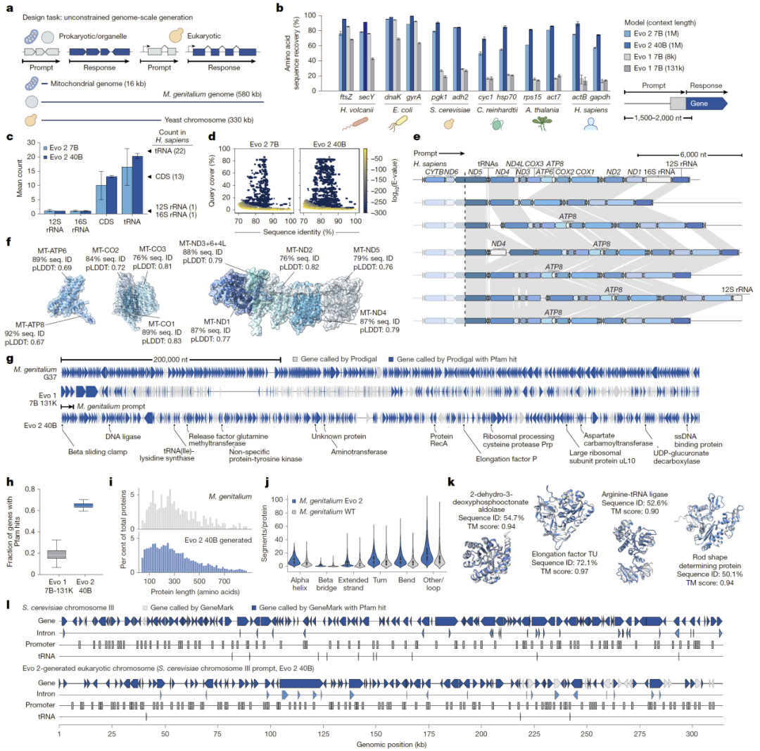 除了预测任务,Evo 2 还展示了强大的生成能力。模型能够生成大规模基因组序列,包括线粒体基因组、细菌基因组以及真核基因组片段。这些生成序列在统计特征和结构模式上与天然序列高度一致。