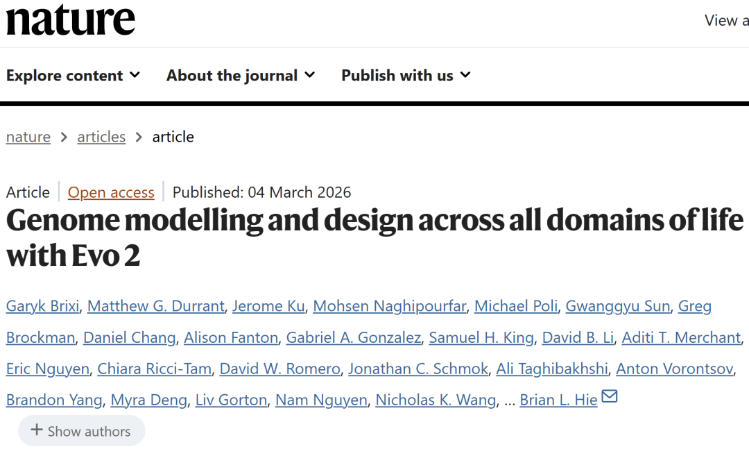Brixi, G., Durrant, M.G., Ku, J. et al. Genome modelling and design across all domains of life with Evo 2. Nature (2026).