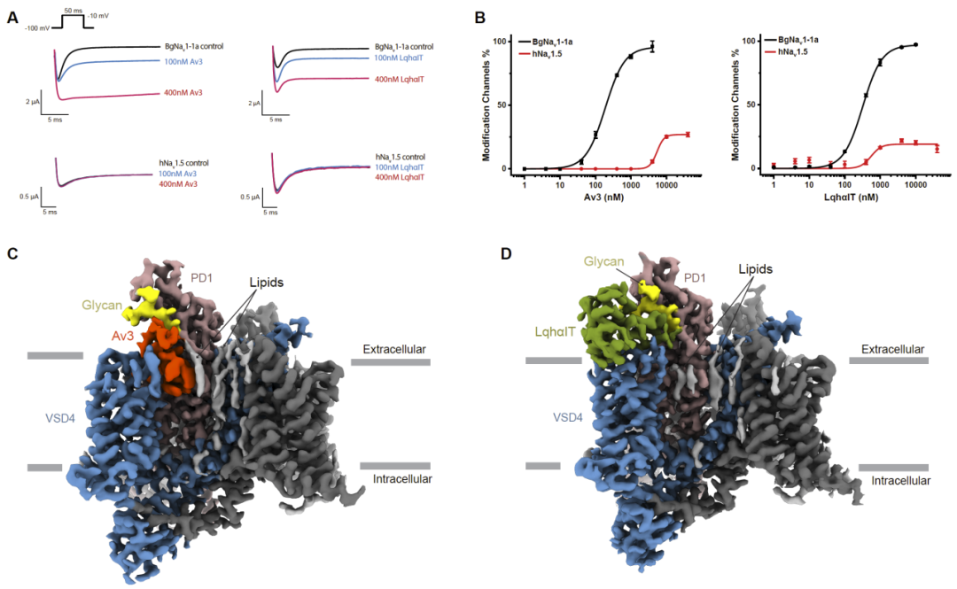 冷冻电镜结构显示,两种毒素均结合在钠通道的VSD4区域,但其结合方式明显不同。Av3嵌入在VSD4与孔道结构之间的膜内空隙中,而LqhαIT则结合在VSD4的细胞外表面。尽管结合位置不同,两种毒素均能够改变VSD4的构象,从而影响通道的失活过程。