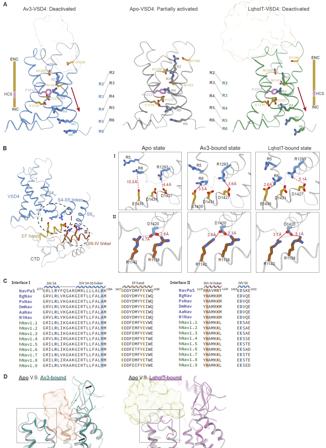 结构分析表明,毒素结合后S4螺旋发生向下移动,使VSD4从部分激活状态转变为去激活状态。这一变化会改变电荷之间的相互作用网络,并限制DIII–IV连接区的运动,从而抑制钠通道的快速失活。
