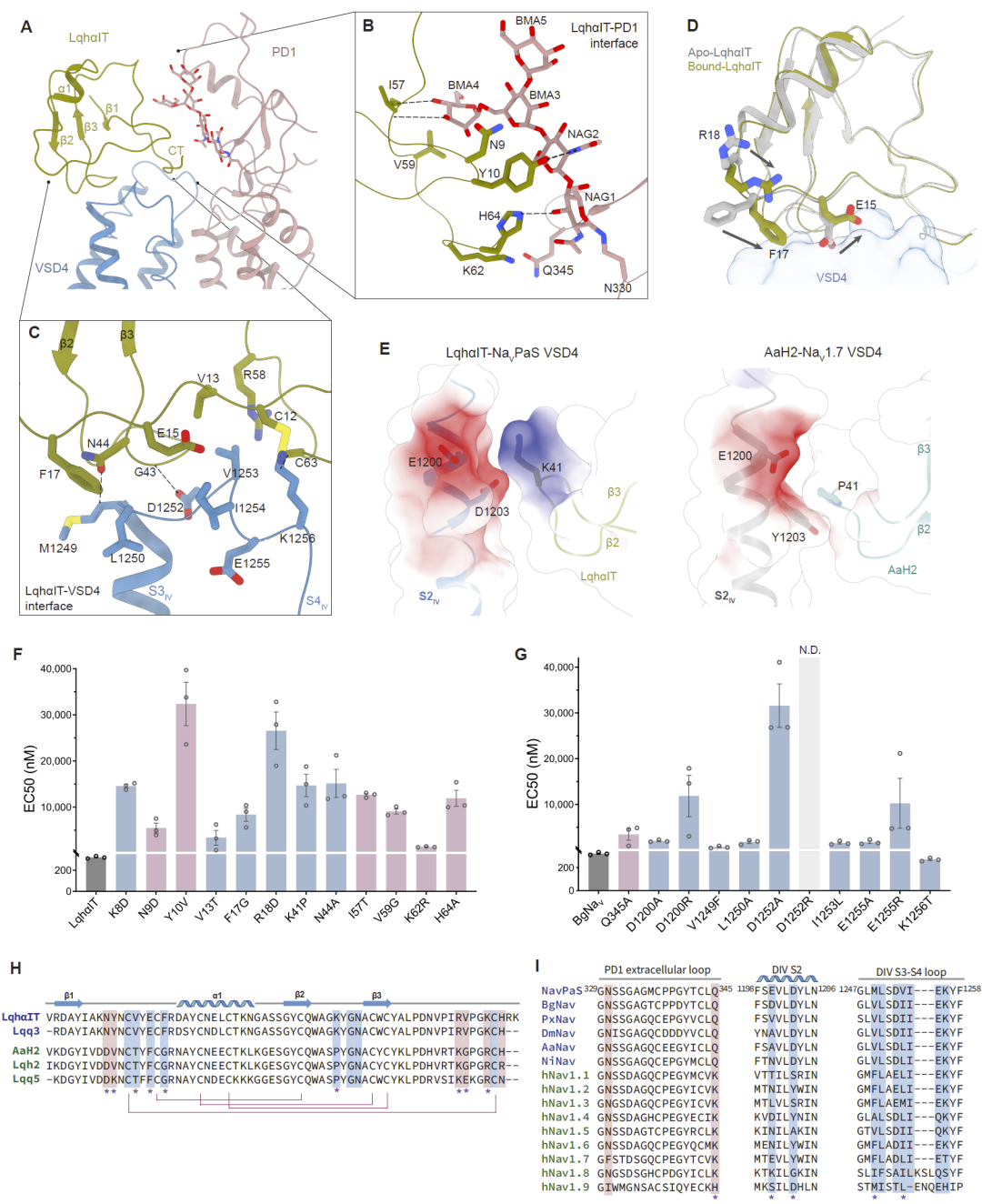 进一步的突变与功能实验揭示了决定毒素选择性的关键残基。例如,Av3与通道之间的疏水相互作用以及部分昆虫特有残基对于毒素活性至关重要。同样,LqhαIT的选择性主要来源于其与VSD4以及糖基结构之间的特异相互作用。这些结构差异解释了毒素为何能够选择性作用于昆虫而非哺乳动物通道。