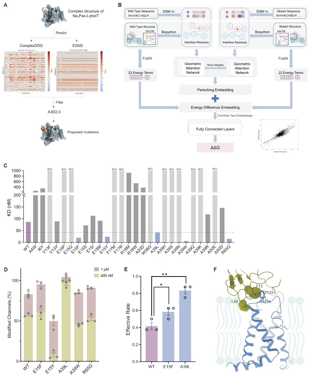 研究人员首先表达并纯化两种毒素Av3和LqhαIT,并构建Na_vPaS蛋白表达体系。随后利用冷冻电镜技术解析毒素与通道形成的复合物结构。为验证关键残基的作用,研究人员通过定点突变、表面等离子共振结合实验以及电生理测定分析毒素与钠通道的相互作用。同时,利用人工智能辅助蛋白设计框架筛选可能增强毒素活性的突变,并通过体外结合实验、电生理测试以及昆虫毒性实验进行验证。
