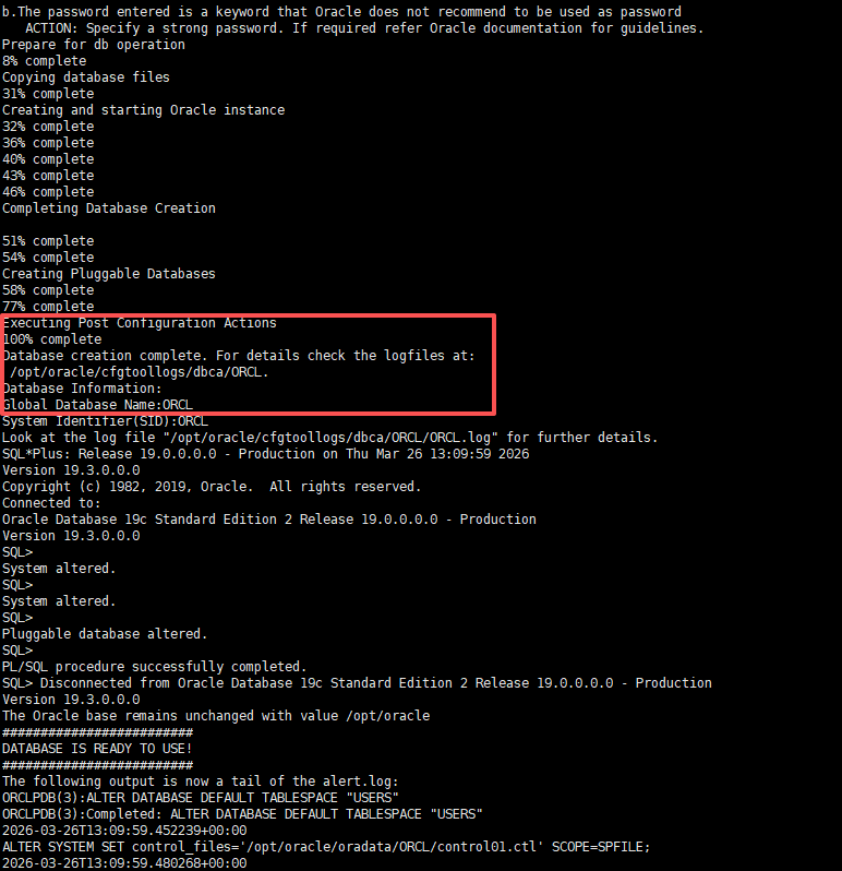 当你看到日志中出现DATABASE IS READY TO USE! 或100% complete字样时,说明安装成功。