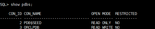 在SQL*Plus中执行以下命令,查看当前的PDB名称