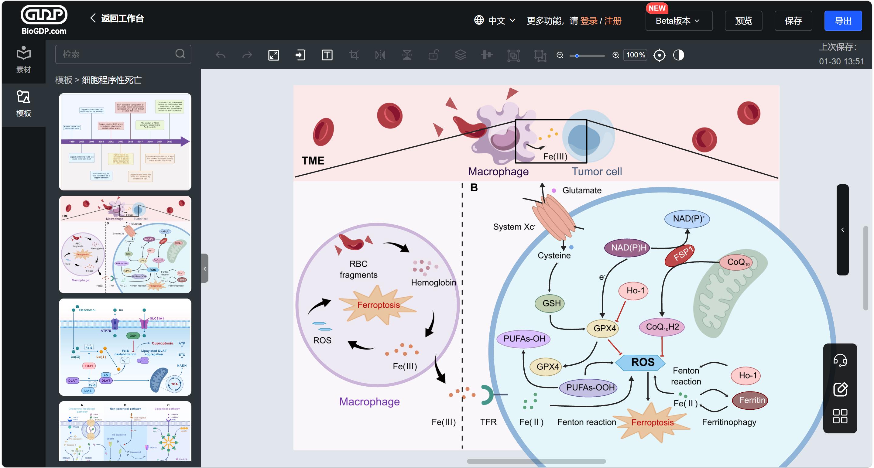 如果你需要绘制信号通路图、实验流程图或综述机制图,BioGDP是绝佳选择。这是一个国产生物医学绘图平台,拥有10000+原创手绘素材,覆盖分子、细胞、动物模型全学科。提供200+顶刊模板,包括流程图、机制图、综述图,直接套用后拖拽替换素材即可。