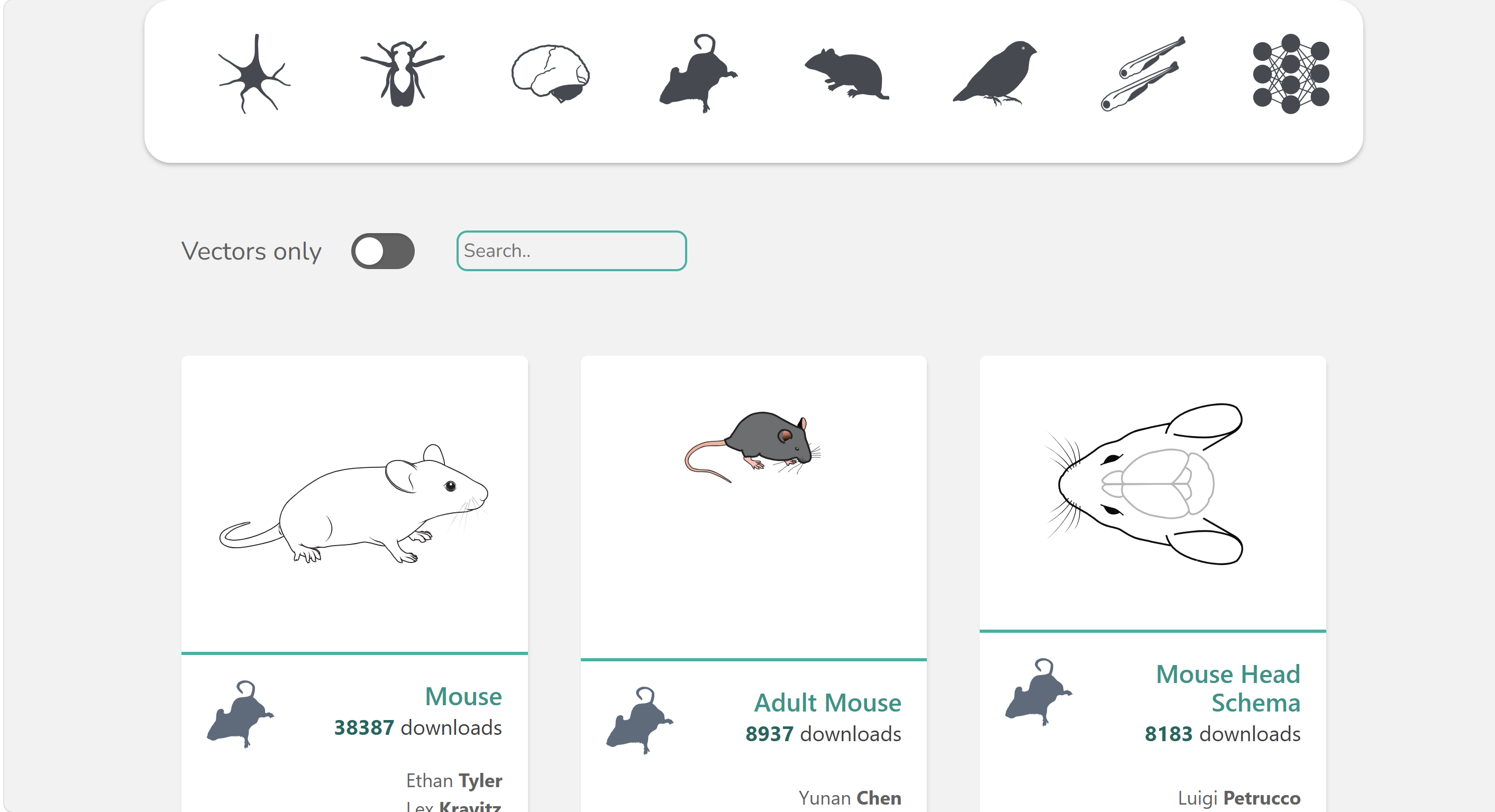 这里的图片都是由专业团队绘制,风格统一规范,基本覆盖了生物医学相关专业的各种资源,如细胞、果蝇、人类、鼠类、鸟类、鱼等。每张图片下面还会显示作者、来源信息等信息,让你清楚地知道素材的受欢迎程度和来源。单击图片,点击“Download”即可保存SVG格式。