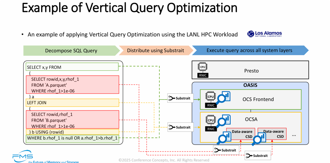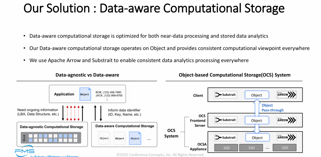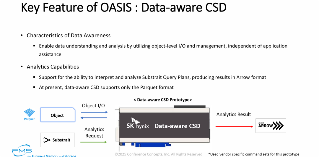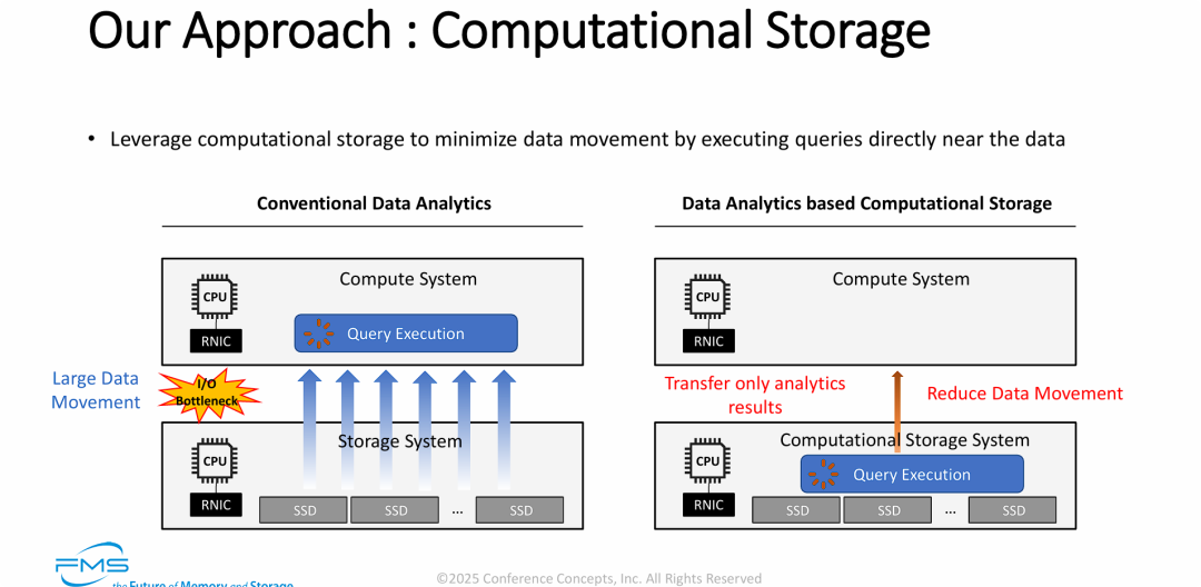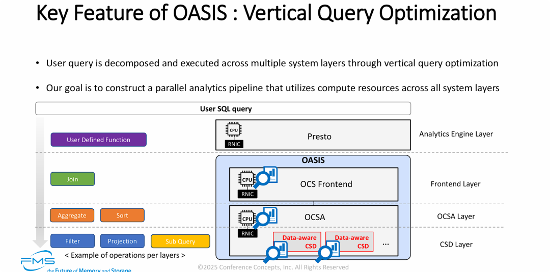 那么,是否可以让存储设备“学会”处理数据?在FMS25峰会上,一项名为OASIS的研究成果给出了答案——通过将数据感知型计算存储设备(CSD)集成到对象存储系统中,实现了查询执行的下沉。测试结果表明,该方案不仅将分析速度提升了4倍以上,更将数据移动量从兆字节级压缩到了千字节级。