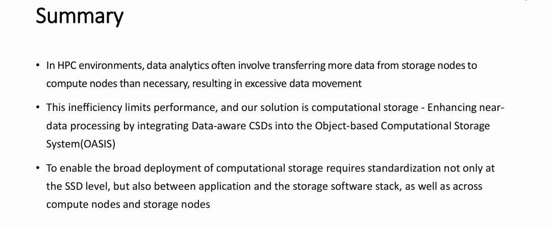 - 解决方案——OASIS:针对上述低效问题,该方案提出了计算存储(Computational Storage)。通过将数据感知型 CSD(Data-aware CSDs) 集成到基于对象的计算存储系统(OASIS) 中,显著增强了近数据处理能力。