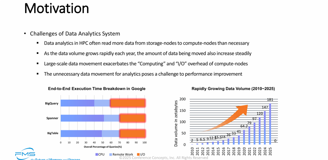 1. 数据分析系统的挑战 指出HPC中数据分析的四大核心问题:过度读取、数据量持续增长、数据移动导致的计算与I/O负担加重,以及非必要数据移动造成的性能瓶颈。