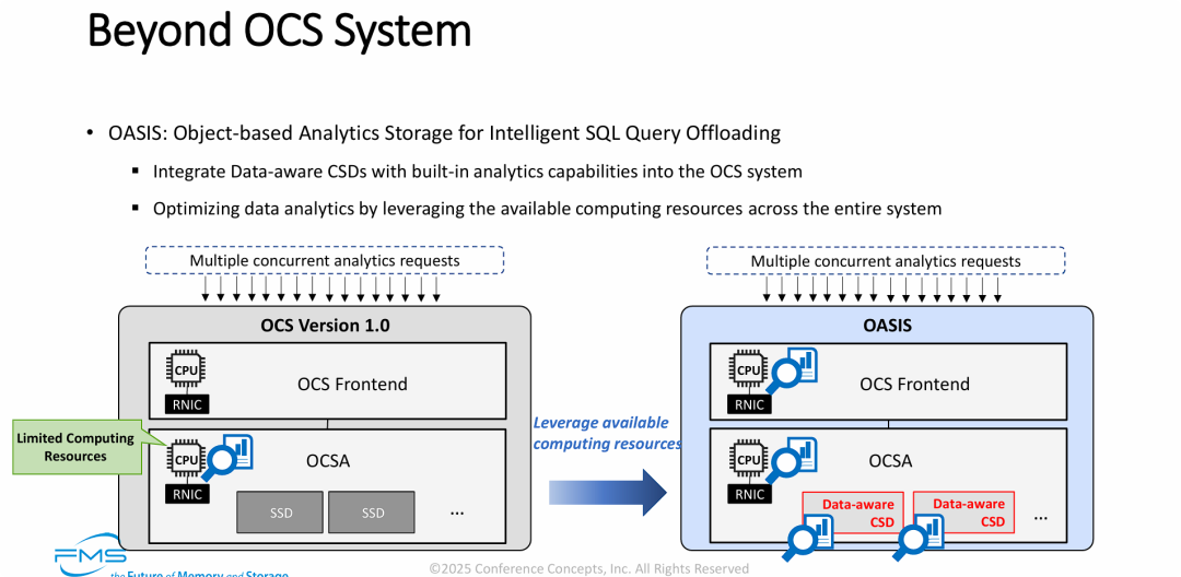 - OASIS (右侧): 引入“利用可用计算资源”机制,在 SSD 层新增 Data-aware CSD。分析任务(放大镜图标)可同时在 OCS Frontend、OCSA 和 Data-aware CSD 三层并行执行。