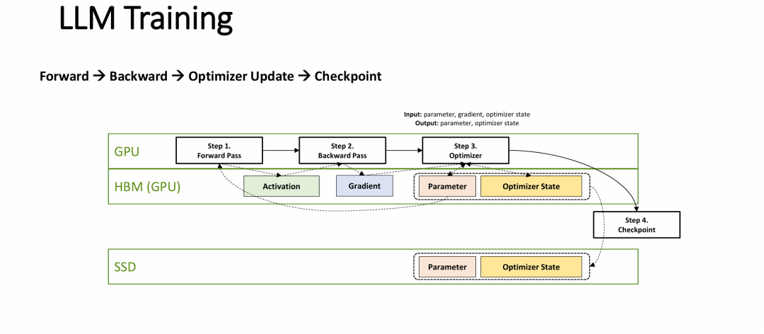 Activation 和 Gradient)仅参与 GPU 和 HBM 之间的内部循环,并不写入 SSD;而真正给底层存储介质(如 SSD)带来巨大 I/O 压力的,正是定期发生的 Parameter 与 Optimizer State 的下盘操作。这为理解存储系统在 LLM 训练中的具体作用和瓶颈提供了技术依据。