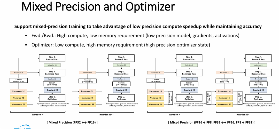 - 算力与内存的解耦优化:明确指出了前向/反向传播是“算力瓶颈”(需低精度加速),而优化器是“内存/存储瓶颈”(需高精度保收敛)。混合精度训练本质上就是在这两者之间不断进行数据格式的转换。