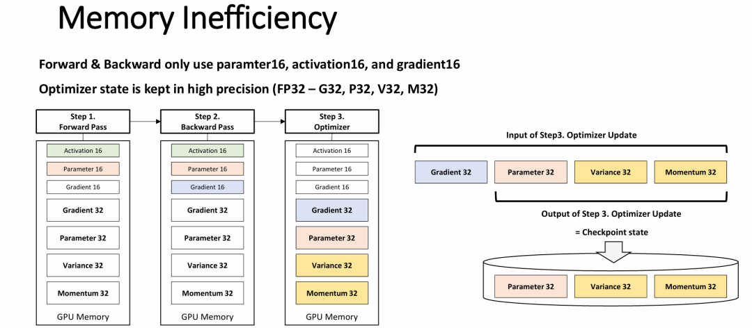 图片从技术底层揭示了大语言模型(LLM)训练中采用混合精度训练(Mixed Precision Training)带来的“内存/存储低效”现象,并解释了为什么检查点文件会如此庞大。