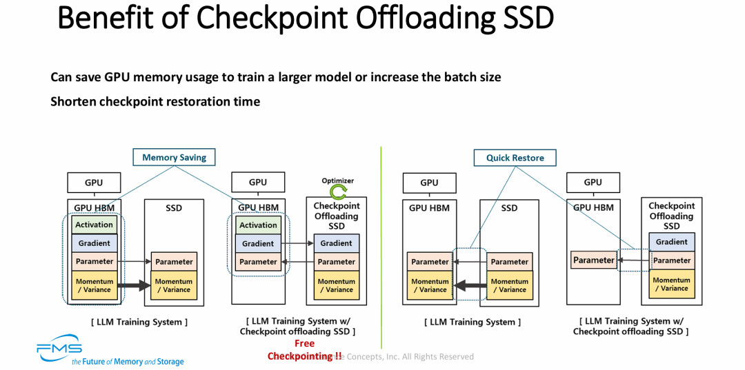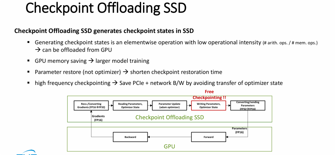 - “零开销”的闭环:通过让高精度的参数和优化器状态在 SSD 内部完成计算并直接写入闪存介质,彻底消除了传统架构中“暂停训练、等待显存数据通过总线倾泻到硬盘”的漫长 I/O 停顿,真正实现了不影响训练性能的高频、甚至无感的“Free Checkpointing”。