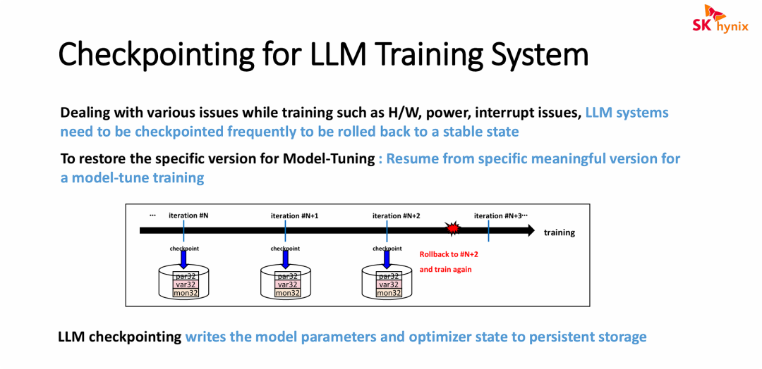 - 对持久化存储的重度依赖:系统需要将海量的“模型参数”和“优化器状态”(即图中的 par32, var32, mon32)定期、高频地写入持久化存储中,这直接凸显了在 LLM 基础架构中,高性能、大容量存储底座(这是SK海力士等存储厂商关注的核心场景)的关键作用。
