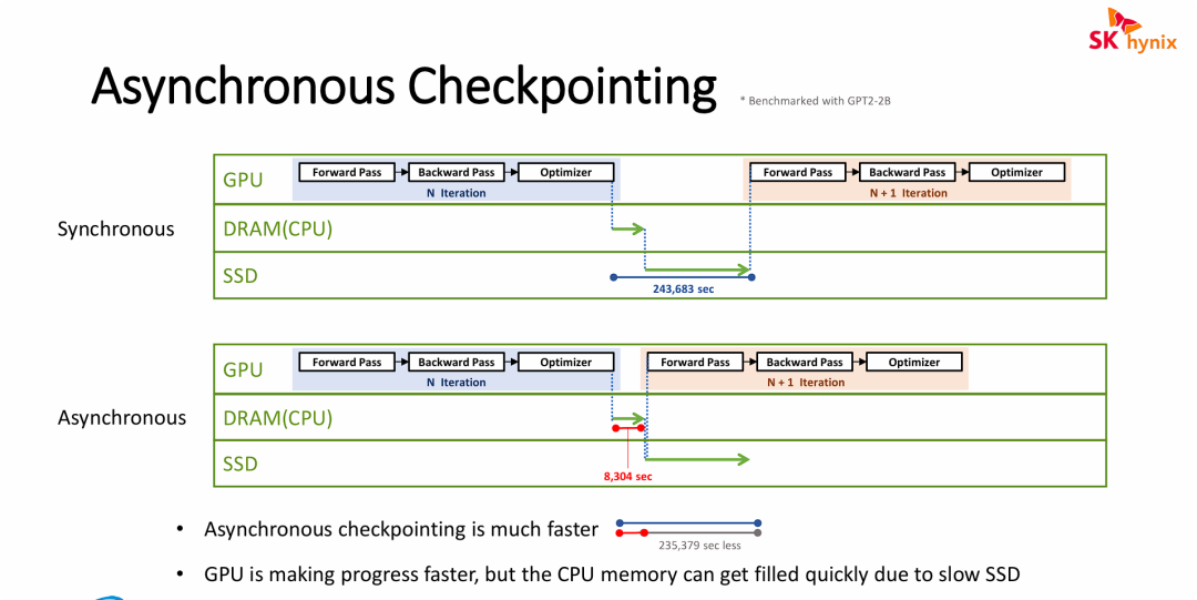 - “空间换时间”的性能狂飙:异步检查点策略通过引入主机端的 DRAM 作为巨大的高速缓冲池,将最慢的“SSD 物理落盘”动作从 GPU 的关键训练路径(Critical Path)中剥离。这完美掩盖了底层存储的延迟,让昂贵的 GPU 算力不再被 I/O 停顿所浪费,极大提升了模型迭代的整体速度。